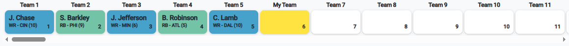 Below the header, you will see a scrollable list of draft picks. This is called the Draft Ticker. As you input draft picks, it will automatically scroll to the current pick.