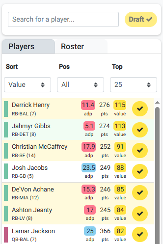 - Value - calculated value based on Projected Points and Value Baselines