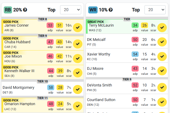 Additionally, the Average Draft Position (ADP) and Value are conditionally highlighted, to show when players are estimated to be selected. The combinations of these estimates can help you visualize the next round of picks.