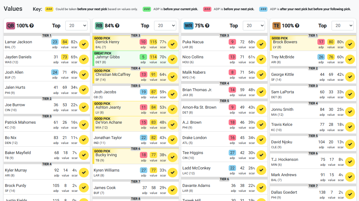 - Positional Scarcity (Scar) - This is the percentage of value remaining at the same position if the player is selected. This assumes the players of higher value at the same position have been selected as well. This dynamically updates as players are selected.