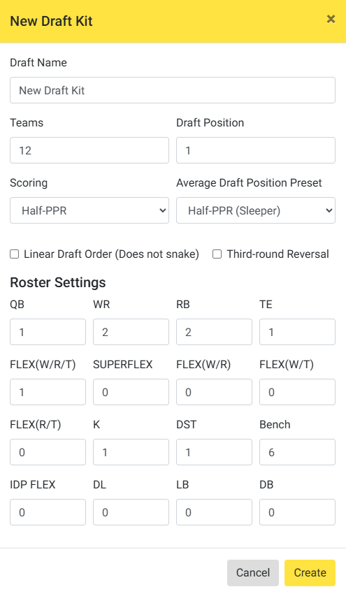 Setting up a new draft kit is quick and easy. From the Draft Dashboard, select the button to bring up a window with basic settings.