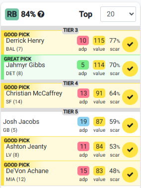 - Positional Scarcity (Scar) - This is the percentage of value remaining at the same position if the player is selected. This assumes the players of higher value at the same position have been selected as well. This dynamically updates as players are selected.